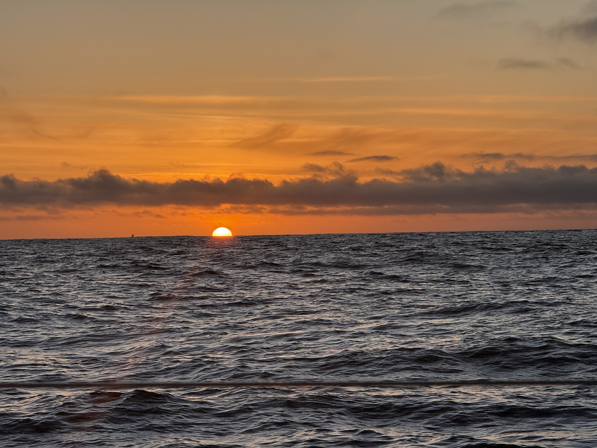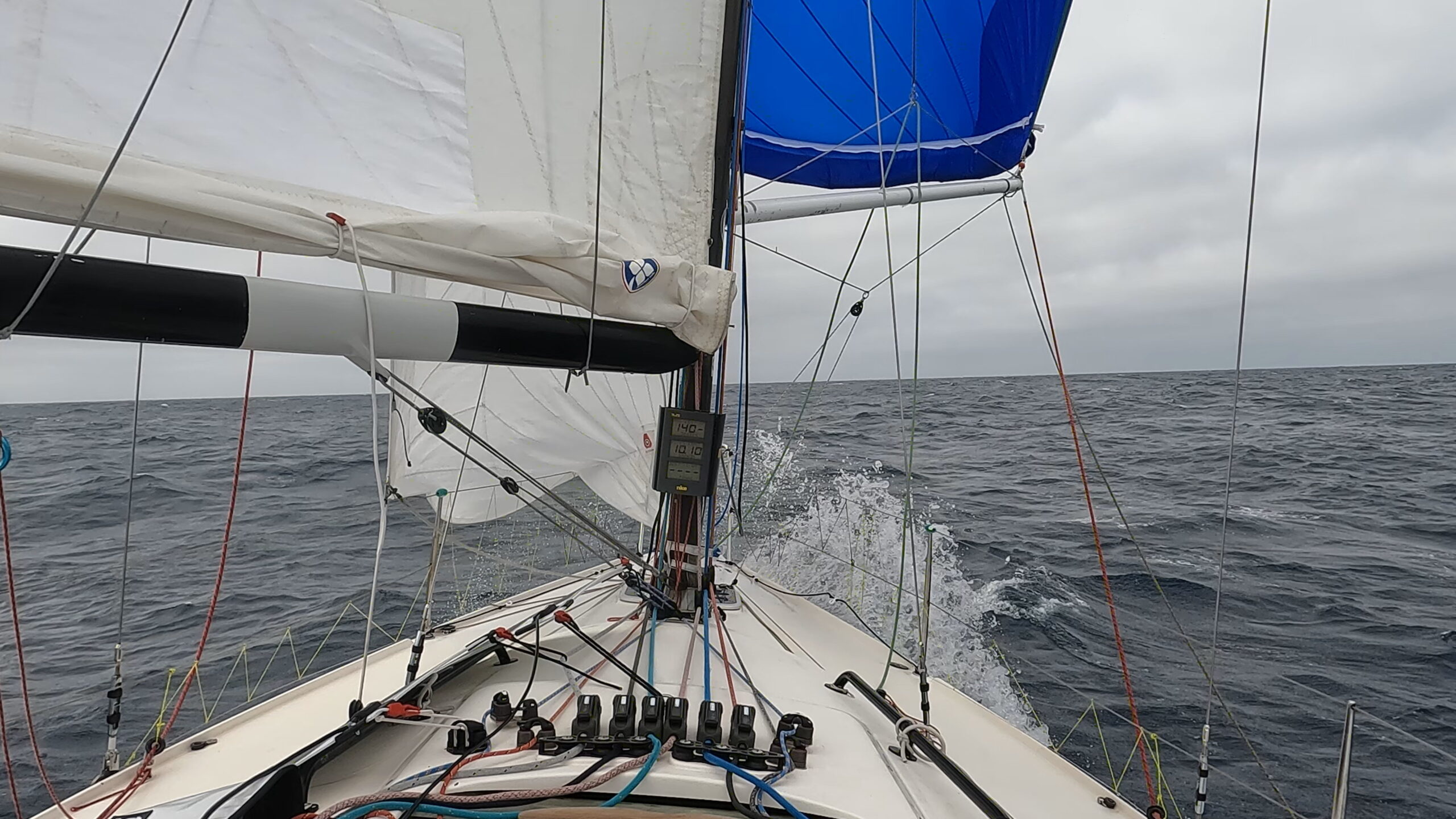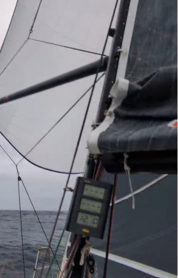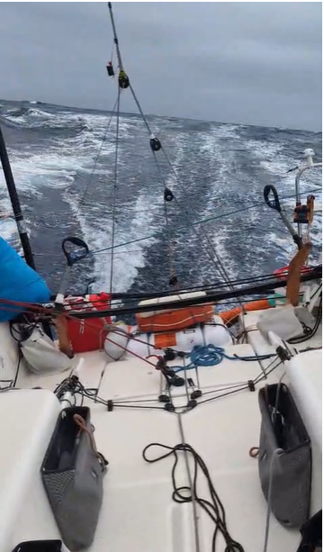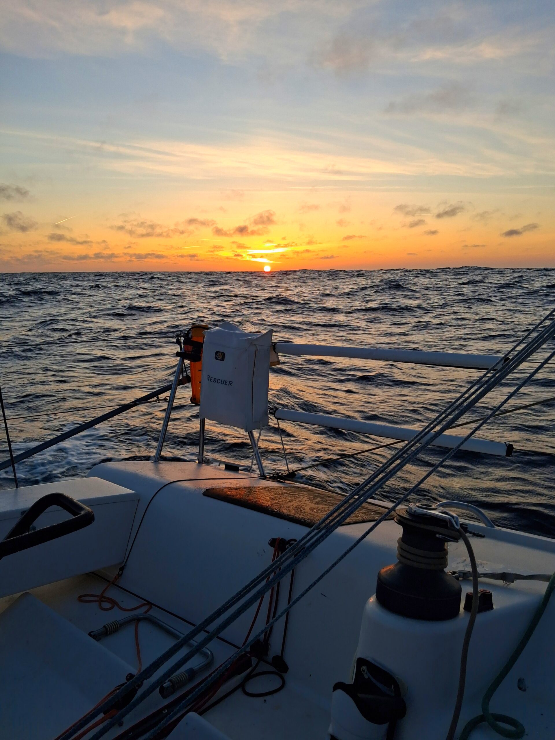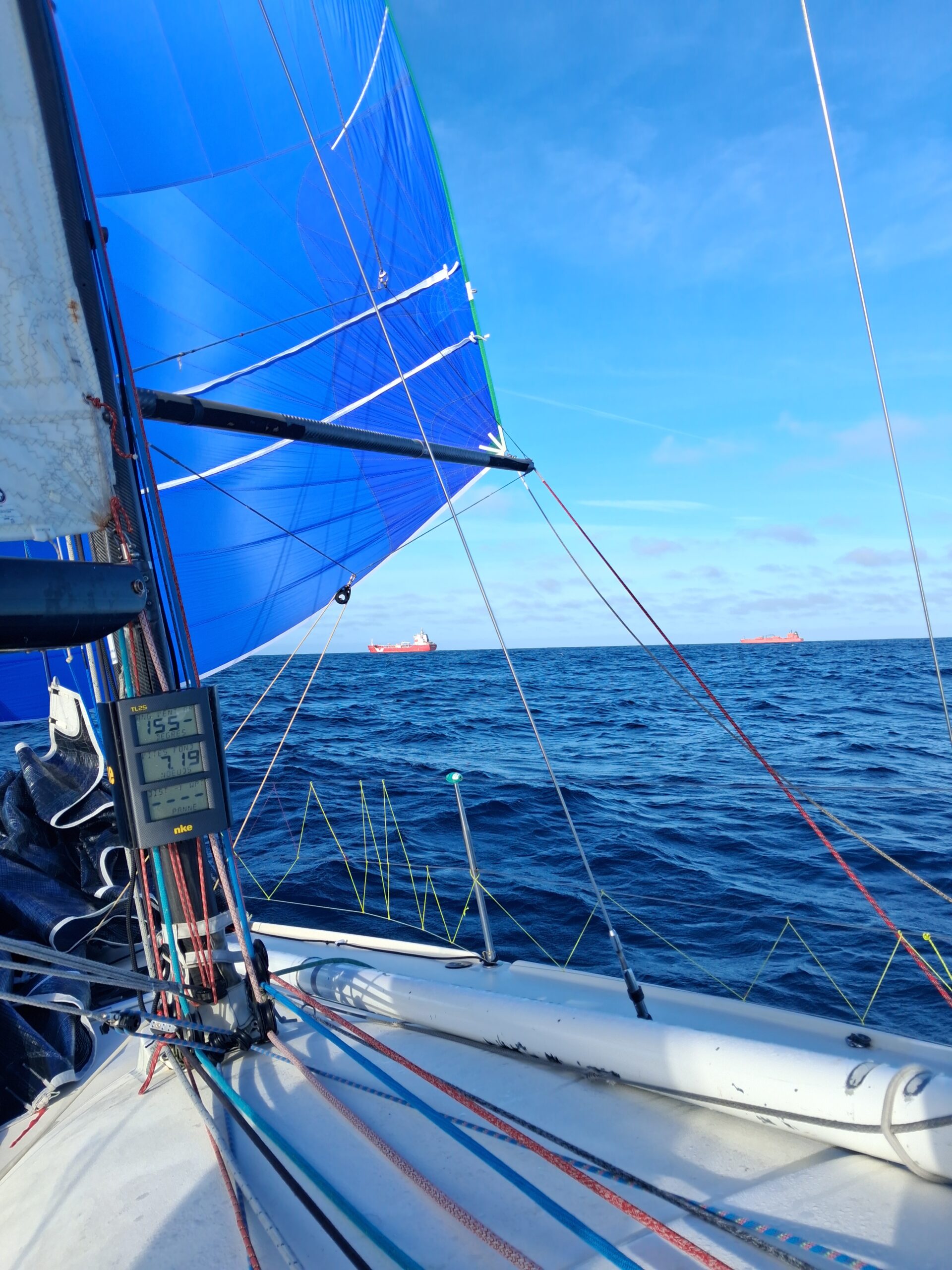 Journée assez cool sous S3, suivie d’une nuit que j’adore : cavaler sous spi. Le bateau à fond les ballons dans 30 nœuds de vent, spi lourd dehors, un ris dans la grand‑voile… du sport, mais du bon, celui qui fait sourire même quand tout vibre.